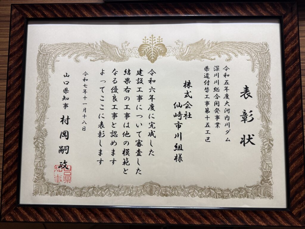 お知らせ 山口県優良建設工事表彰(令和7年度) 山口県優良建設工事表彰(令和7年度) 令和7年度 山口県優良建設工事等表彰授与式が令和7年11月18日に長門土木建築事務所で行われ、弊社が担当した『令和5年度 大河内川ダム深川川総合開発事業県道付替工事 第15工区』の優良工事表彰状を授与していただきました。今後も模範となる工事を行い、地域社会の成長と発展に寄与できるよう努めて参ります。